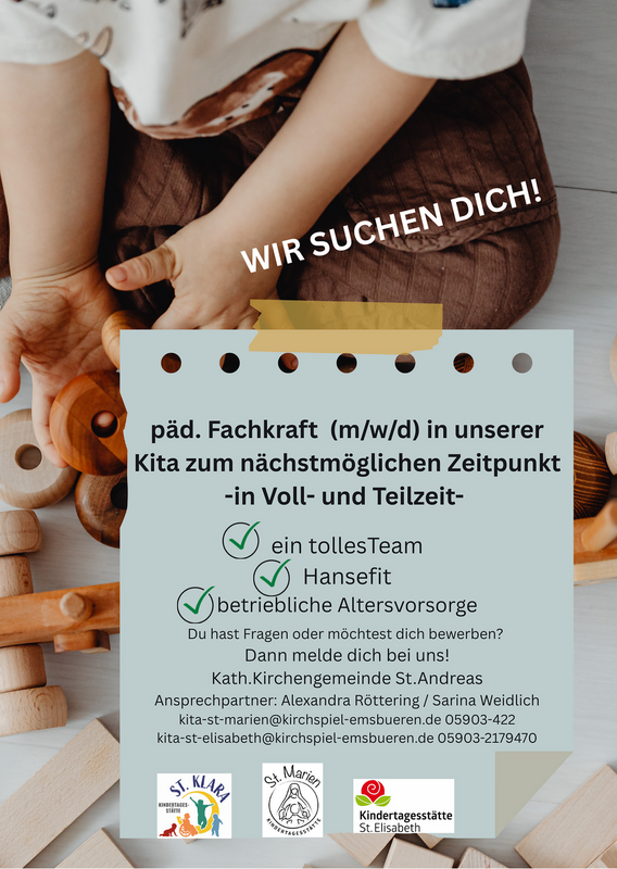 zum nächstmöglichen Zeitpunkt suchen wir eine pädagogische Fachkraft (m/w/d) in unserer Kita!